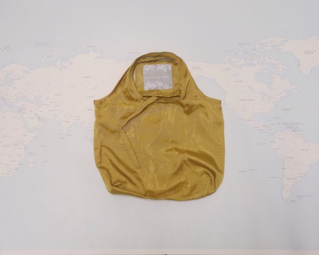 在沖繩國際通買的,鮮明的素面芥黃色一下就吸引了我,價格略貴但非常實用。收納方式是將袋體折好後塞進小口袋裡(提手下那一塊灰白色區域,平常自然垂在袋體裡)。這款材質比較厚,不容易溼,儘管尺寸比較小,折起來後卻跟前一個差不多。這個尺寸非常實用,底部剛好能躺一瓶礦泉水,畢竟不是天天上超市,只買一兩樣東西時用它剛好,就不怕大袋子一直撞到人;尤其是出門旅遊時裝水瓶、相機等隨時取用的小東西很方便。還有附兩條帶子可以將袋口繫起來,設計相當貼心。同款我還買了一個深色、材質更薄透的,適合收在體積超小的手拿包裡。